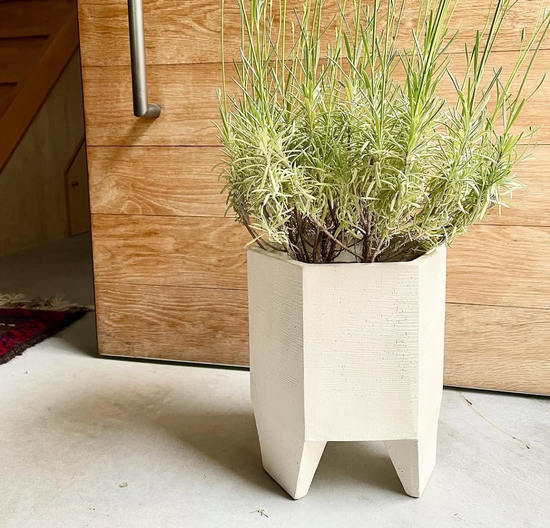material :Stone Ware 底穴なし water proof 六角形のボディーに一体型の脚が付いたスッキリとした印象のポットカバーです。 ユニークな佇まいは、植物を個性的に演出します。 丸でも四角でもない、多面体ならではのインパクトを与えます。