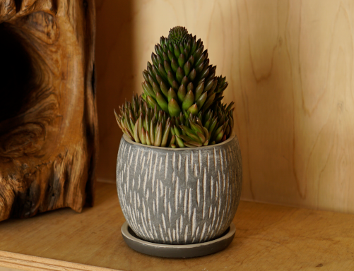 material:Cement 底穴あり 簡易防水 屋外使用可 ぽってりとしたフォルムにカービングのクラフト感が相まって愛嬌のある可愛らしいポットに仕上がりました。ゆるりとした手作りのようなフォルムが素朴で温かな雰囲気です。