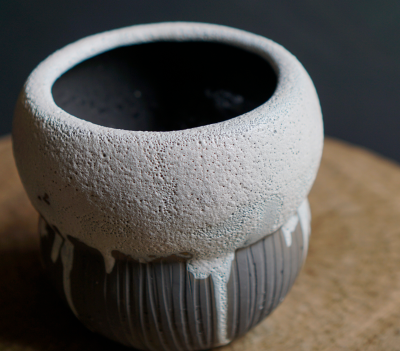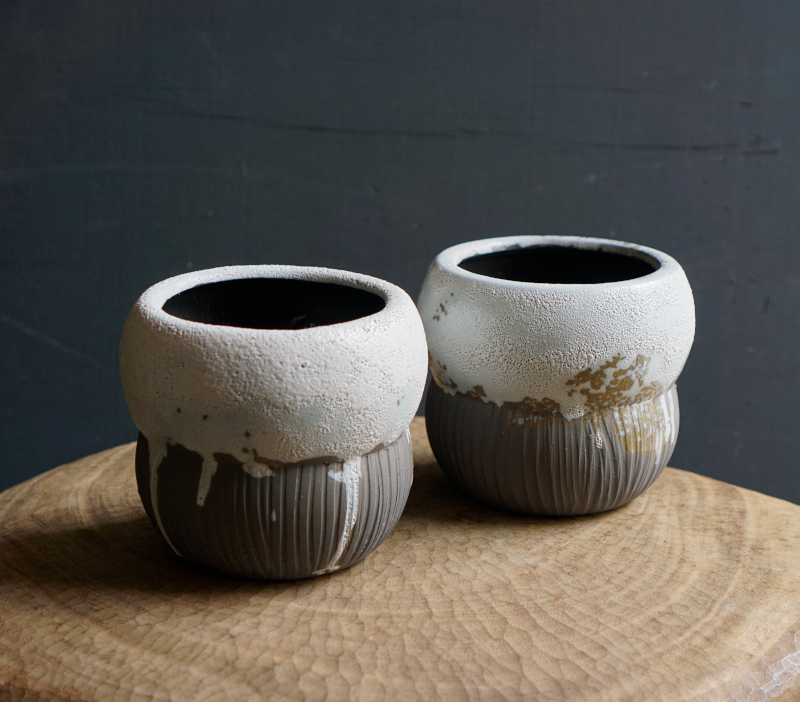material:Ceramic 底穴なしwater proof 陶土の土に滴るように流れる釉薬の表情が味わい深い落ち着いた雰囲気を持つポットカバー。 馴染みのよい丸いフォルムがどんな植物ともよく合います。