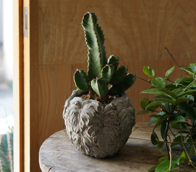 material : Cement 底穴なし簡易防水 丸いポットを覆うように重なりあうモンステラの葉のモチーフが立体的で深みがありオブジェのように存在感があります。 受け皿と共にセットし鉢カバーとして、また多肉植物は直植えでも。